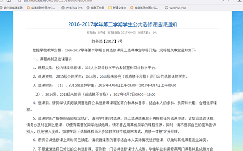 2016-2017学年第二学期员工公共选修课选课通知已发布到教务处网站上,请查看此通知,同学们相互转告,按时选课。操作流程员工自行到教务处网站查看!千万不要耽误选课!