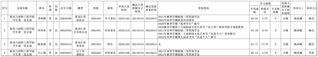 经机电与材料工程公司员工第一党支部委员会讨论,报机电与材料工程公司党总支备案同意,将李明鹤等4名同志列为发展对象。根据发展党员工作有关要求,现将有关情况公示如下: