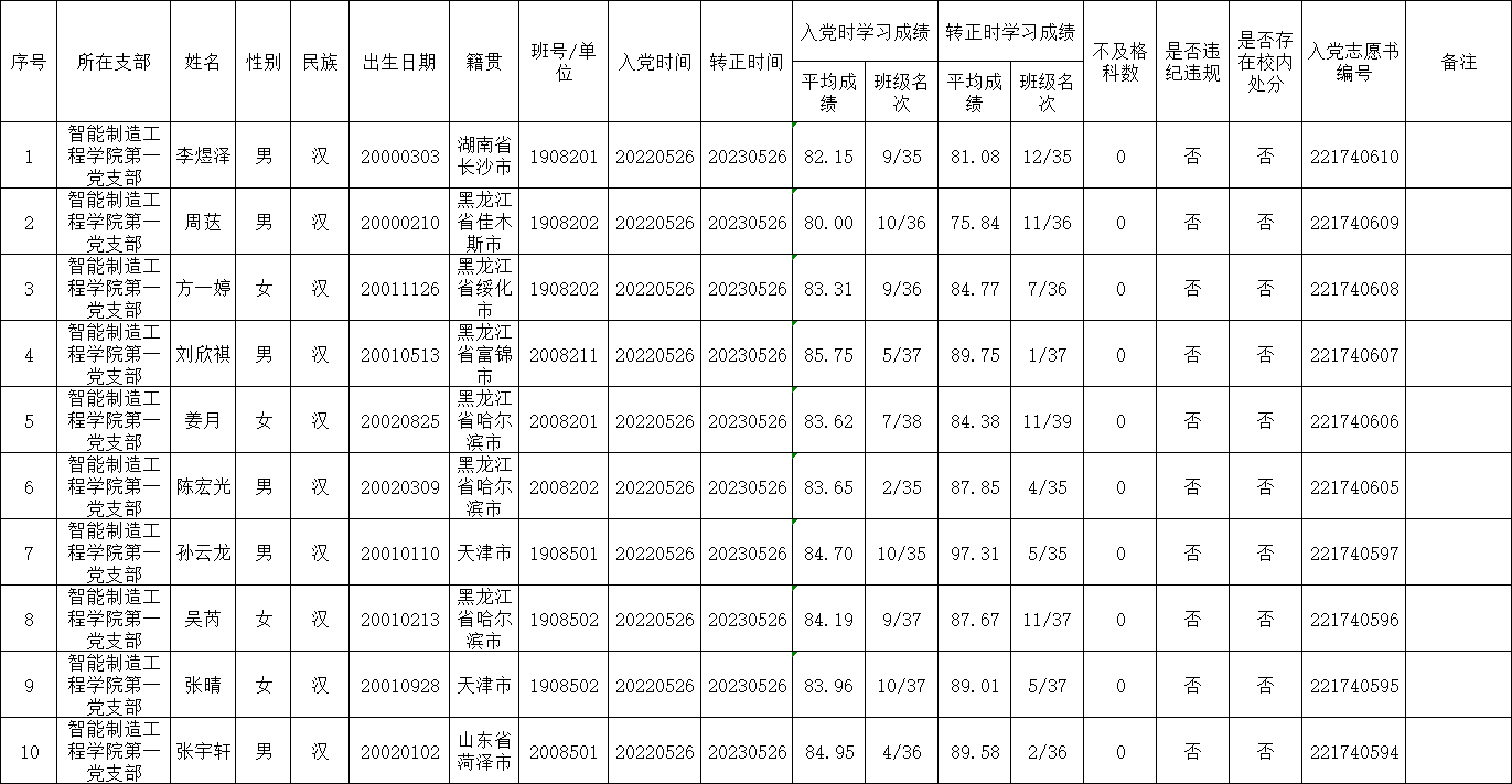 在听取党员和群众意见的基础上,经党支部委员会审查,拟将李煜泽等10名同志转为中共正式党员。根据发展党员工作有关要求,现将有关情况公示如下: