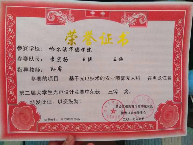 4603寝室宋超越同学在校期间曾担任工控协会副会长,机器人工程公司科协部部长,曾荣获省三好员工、第五届“台达杯”高校自动化设计大赛一等奖,通过校企合作应聘到中达电子股份有限公司工作;王博同学曾任员工协会委员、辅导员助理,曾荣获黑龙江省老员工科技创新大赛三等奖,今年公务员省考报考了绥化市发展与改革委员会,顺利通过笔试,目前在准备面试;王超同学曾荣获黑龙江省老员工科技创新大赛三等奖、校员工科技节三等奖,通过校企合作应聘到吉利集团工作;李宏扬同学曾任班级班长,在校期间乐于助人,能认真完成课业任务,并在课余时间积极与同学开展自主兴趣研究,和团队一起研发农业喷雾无人机。