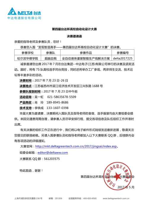 经过网上报名、台达自动化知识网络考核、参赛项目方案书的撰写和提交、专定评审等环节,2017年5月19日,“发现智造高手”——第四届“台达杯”高校自动化设计大赛决赛名单荣耀揭晓。由机器人工程公司自动化教研室主任李冰老师带队,员工姚远、武富龙、王艳禄组成的超越自我队(参赛题目:全自动液体灌装智能生产线解决方案),从海峡两岸各大高校,以及东南亚部分国家大学的300多支报名队伍中成功突围,进入最后的总决赛,并将于2017年7月23日-26日赴江苏省苏州市吴江区台达集团中达电子有限公司,与来自全国各地(包括台湾省)和东南亚国家大学的各支参赛队伍进行总决赛的较量。