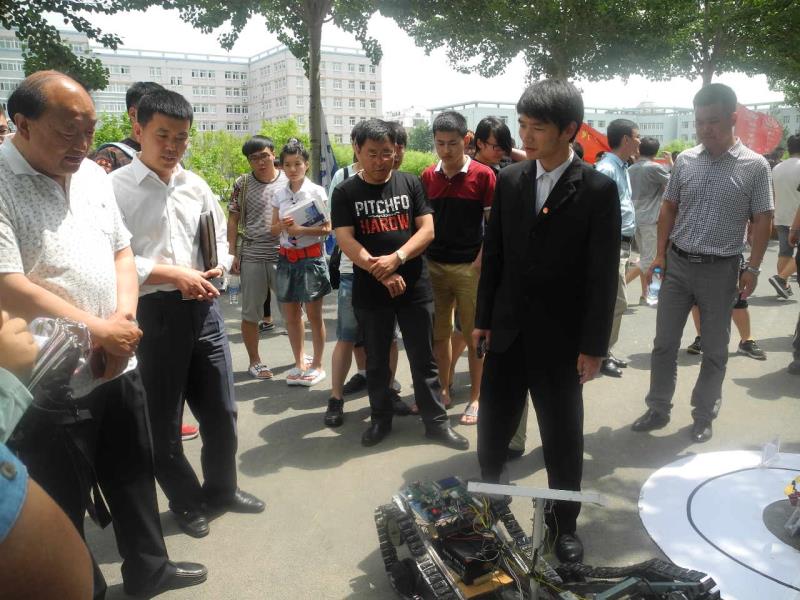 本次参展作品共设作品展区和图片展区两部分,其中在作品展区,一件件由分院焊接技术社团、零点实验室、CAD社团、机械创新实验室等十个优秀社团制作的,共有300余件作品进行参展。其中不乏分院员工自主研制并获得国家新型实用专利的作品,如智能大棚管理系统、智能邮件分拣系统、智能超市和旋转LED显示屏。在本展区,最为耀眼的是分院员工刚刚制作完成的铁艺机器人“中国梦战士”,此作品2.56米高,由分院吴犇、李玉龙两位教师技术指导,分院焊接技术社团制作,汽车涂装社团协助历时二个月的时间在母校22华诞之际制作完成,谨以此献给母校,恭祝母校生日快乐。活动中,分院员工还向现场领导、老师演示基于SPM32四轴飞行器,太阳能除草车、太阳能清洁车等多项员工成果,得到校领导好评。
