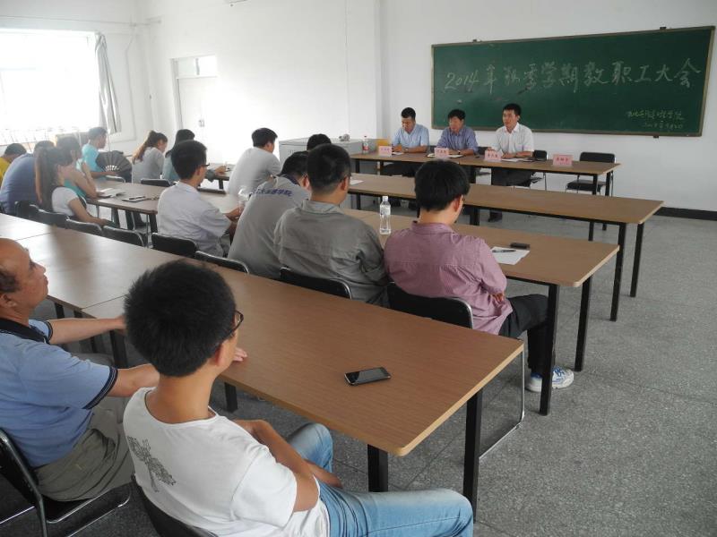 9月2日,公司在第七教学楼315教室组织召开2014年秋季学期教职工大会。校特聘专家、博士生导师于建国、机电与汽车工程公司常务副经理李长威、机电公司副经理吴柏宇出席,分院全体教师参加,会议由分院副经理付洪涛主持。