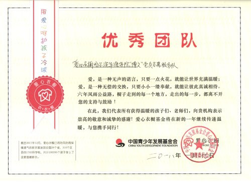 1月27日,公司“博文”党员志愿服务队喜获中国青少年发展基金会爱心衣橱基金管理委员会颁发的“优秀团队”荣誉证书。