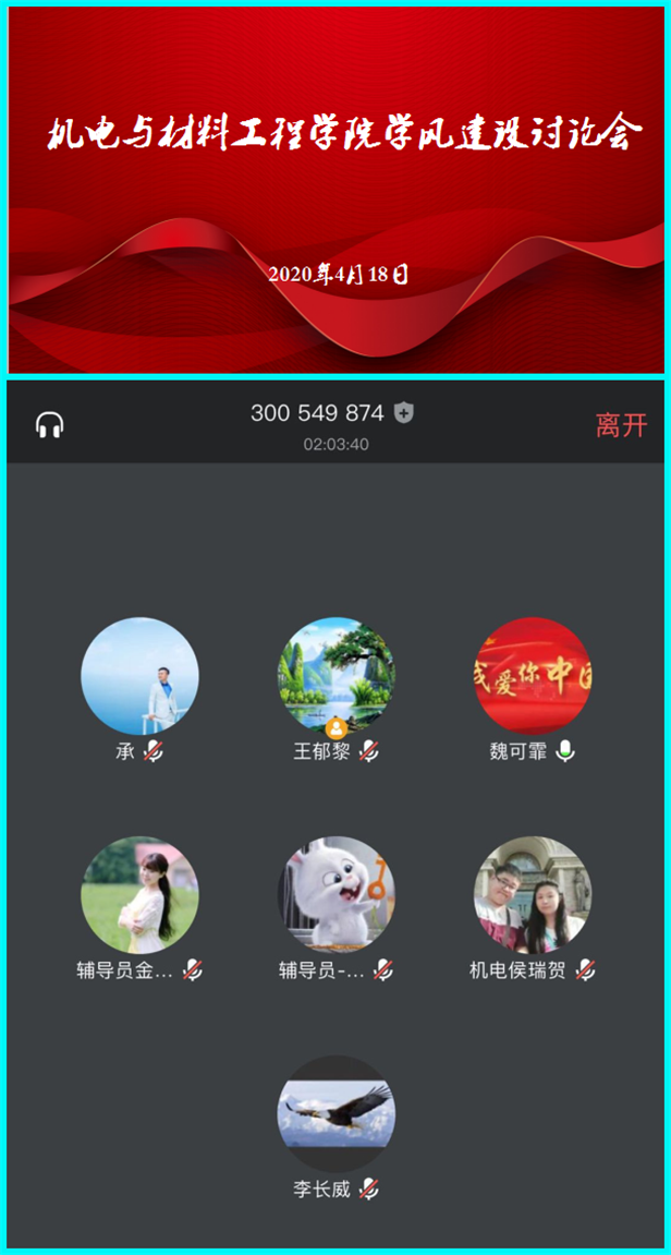 4月18日,为深入贯彻落实全国全省教育大会精神,进一步发挥公司办学育人理念和整体建设理念在培育良好学风方面的重要作用,切实有效做好疫情期间公司产品质量与人才培养质量的双提高。机电与材料工程公司通过【腾讯会议】召开了“雏鹰计划”学风建设工程讨论会。董事长助理兼组织部部长魏可霏、董事长助理兼机电与材料工程公司经理李长威及公司全体员工工作者参会,会议由公司党总支书记王郁黎主持。