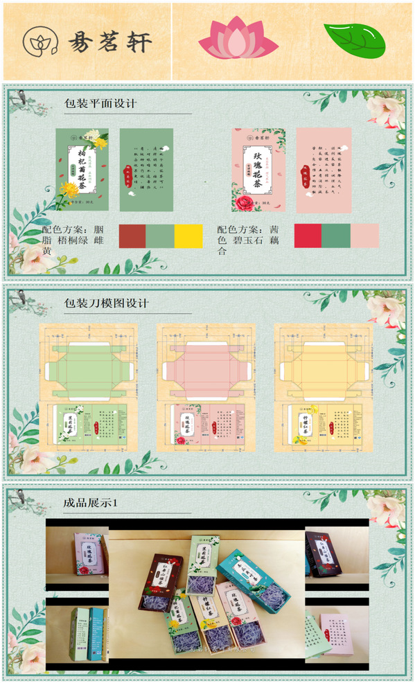 1702911班顾子琦作品:利用纸张彩印的方式,对全套茶叶品牌包装进行视觉和包装设计,体现了员工产品包装设计的专业性和创意性。