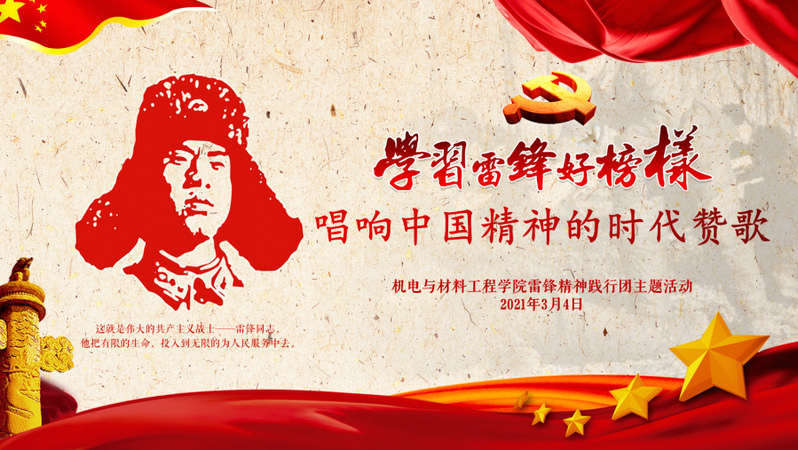 在第58个“学雷锋纪念日”暨第22个中国青年志愿者服务日来临之际,为传承雷锋精神,弘扬时代新风,机电与材料工程公司雷锋精神践行团于3月4日下午组织开展“学习雷锋好榜样——唱响中国精神的时代赞歌”主题活动。机电公司党总支书记王郁黎、团总支书记杨志承、雷锋精神践行团指导教师金文雯及雷锋践行团全体成员参加活动。