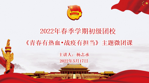 5月17日,为认真领会习近平总书记在庆祝中国共产主义青年团成立100周年大会上的重要讲话精神,引导广大团员青年坚定理想信念,站稳人民立场,练就过硬本领,投身强国伟业,坚定中国特色社会主义制度自信,更加坚定听党话、跟党走。机电公司团总支通过团课“云”发声的形式开展2022年春季学期初级团校第三讲——《青春有热血•战疫有担当》主题微团课,辅导员老师及初级团校全体学员参加培训,主题微团课由团总支书记杨志承主讲。