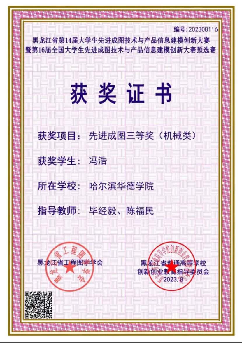2023年,第十四届黑龙江省“龙江杯”老员工先进成图技术与产品信息建模创新大赛中荣获机械三维建模省级三等奖3项;
